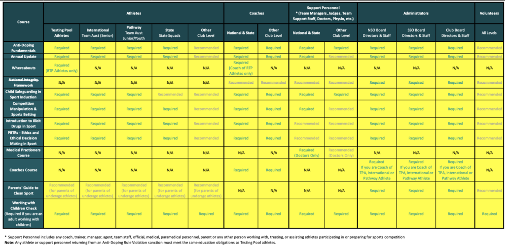 SIA supports sport integrity with a range of excellent virtual education resources. The table below indicates the requirements of the various stakeholders within our sport to ensure they have viewed the corresponding educational resource so that we can be sure we have complied with our SIA Integrity Educational Plan. Additionally, you can download a pdf copy of the table here.